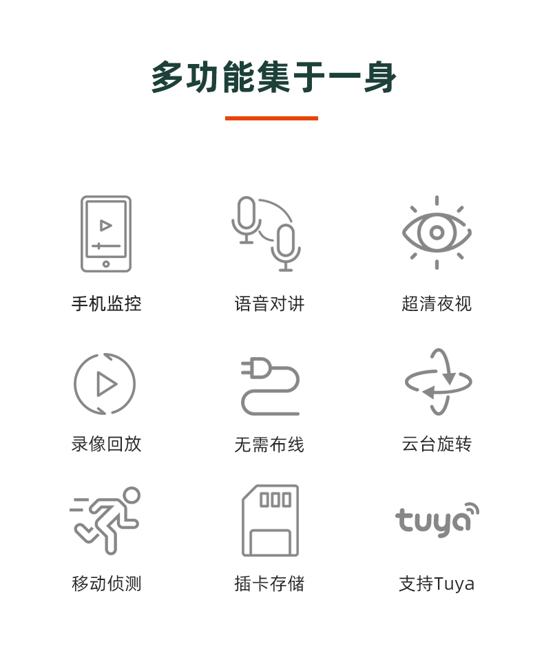 概述:多功能集于一身:手机监控,语音对讲,超清夜视,录像回放,无需布线,云台旋转,移动侦测,插卡存储,支持Tuya。